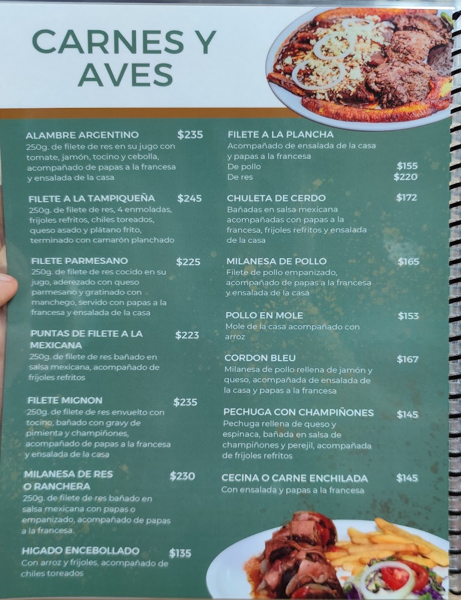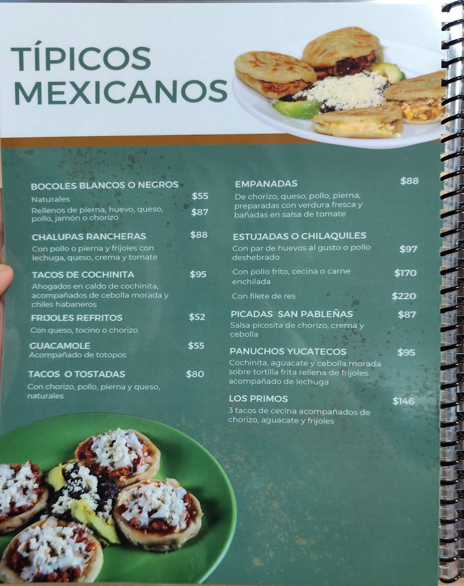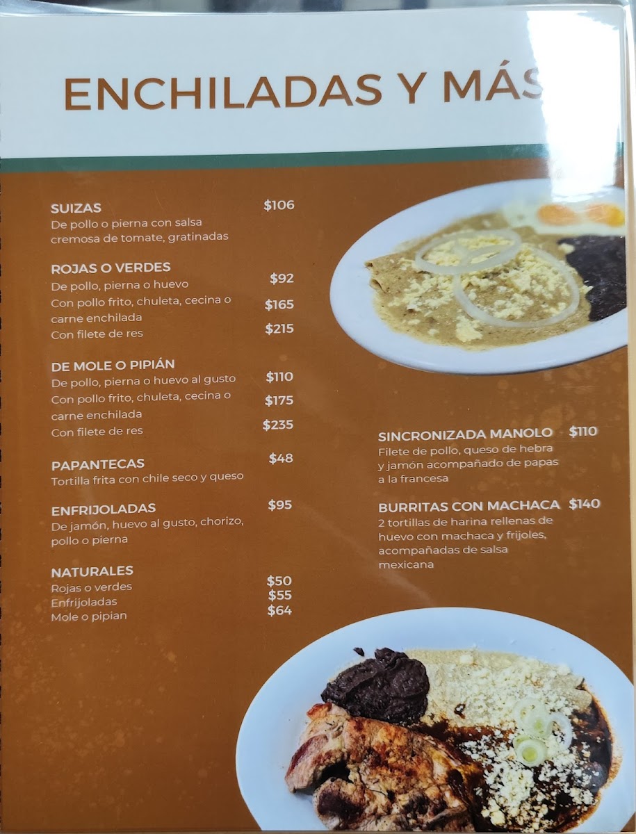 The main dishes include regional specialties such as enchiladas suizas, chile huevillo, tampiqueña, and huevos motuleños. Additional savory options feature items like bocoles rellenos de queso y huevo, entomatadas con cecina, estrujadas con cecina, pollo con mole, and enmoladas. Side dishes such as salads and beans are also available, complementing the larger plates.