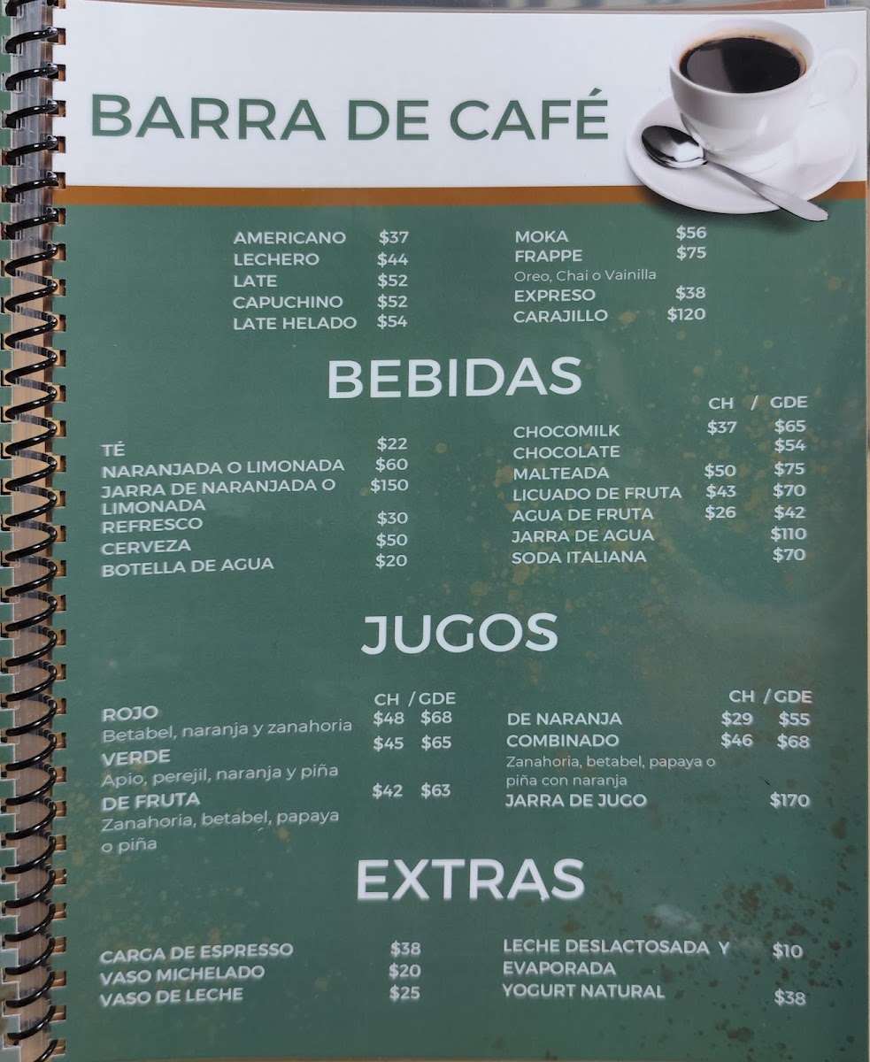 For beverages, the menu presents several coffee varieties, including café capuccino and capuchino, as well as frappes and fresh juices like betabel, naranja y zanahoria.